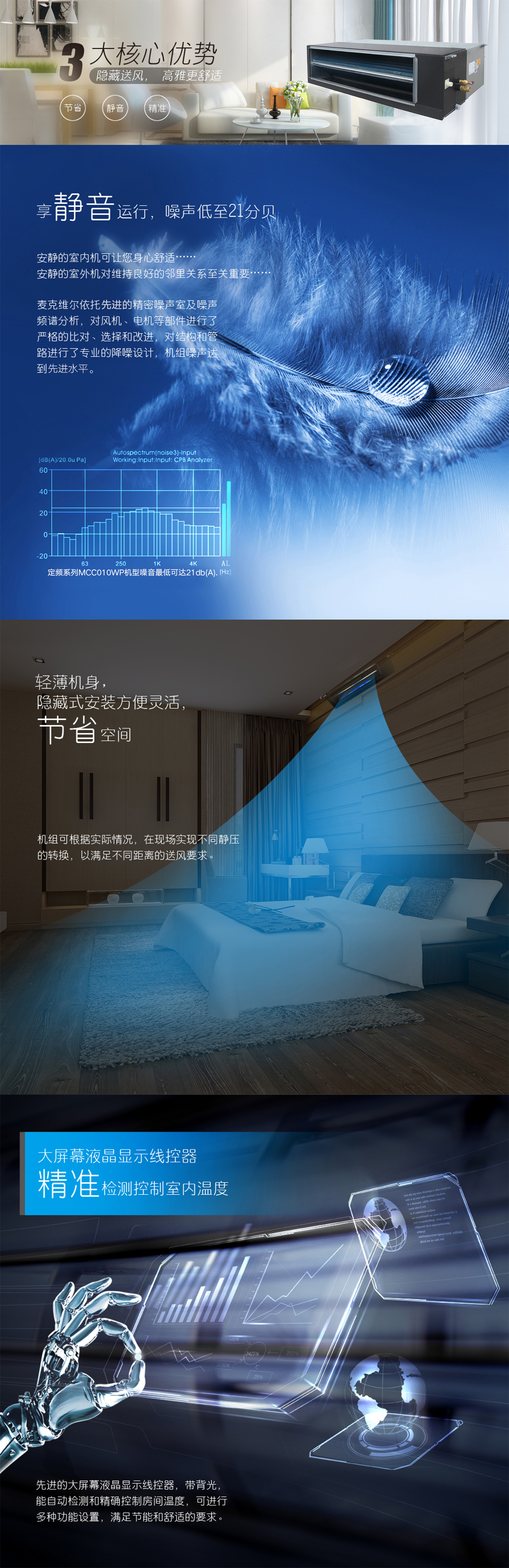 產(chǎn)品理念:采用變頻科技,讓機(jī)組時(shí)刻處于高效的工作狀態(tài)。應(yīng)用窄型結(jié)構(gòu)設(shè)計(jì),大幅度節(jié)約安裝所用空間,可與各類裝修風(fēng)格融合。依托于精密噪音實(shí)驗(yàn)室和先進(jìn)的多通道噪聲分析模擬軟件,通過結(jié)構(gòu)和控制邏輯的優(yōu)化創(chuàng)新,針對性的對室內(nèi)機(jī)噪聲源進(jìn)行遏制和隔斷,打造安靜的室內(nèi)空間。