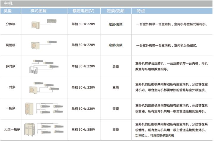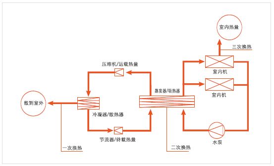 室外機一般稱為冷熱水機組,室內機一般稱為風機盤管,通過水管連接。室外機組產生冷/熱水,用水泵送入每個室內機,室內空氣與水換熱達到溫度調節的目的。