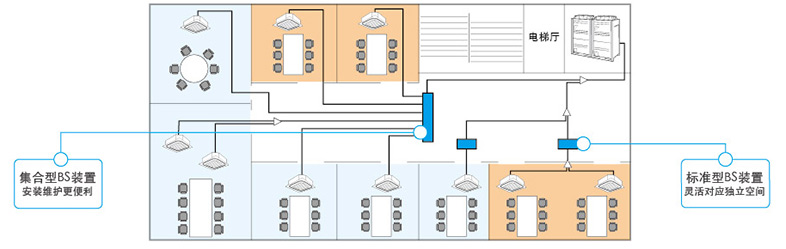 VRV自由冷暖系列通過追加BS裝置及吸入氣管,可實現在一套空調系統內的同時制冷制熱運轉,充分配合各種建筑中的人性化冷熱需求。兩種BS配件選擇,大幅度提高設計靈活性:標準型BS裝置和集合型8S裝置可滿足不同的設計要求,標準型BS可靈活對應獨立空間,集合型BS可使系統安裝維護更便利。